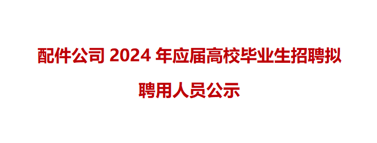 根據配件公司2024校園招聘實施方案和有關制度要求,確(què)定付一明等10人(名單(dān)附後,以姓名首拼爲序) 爲我公司拟聘人選,現面向社會進行公示。公示期五天,自2024年5月30日至2024年6月3日止。 監督電話: 0551-63689007 來信地址:合肥市蜀山區卧雲路3036号安......