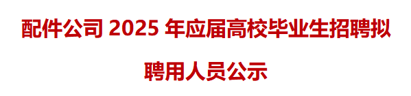 根據配件公司2025校園招聘實施方案和有關制度要求,確(què)定黃冰虹等8人(名單(dān)附後,以姓名首拼爲序) 爲我公司拟聘人選,現面向社會進行公示。公示期五天,自2025年5月26日至2025年5月30日止。 監督電話: 0551-63689007 來信地址:合肥市蜀山區卧雲路30......