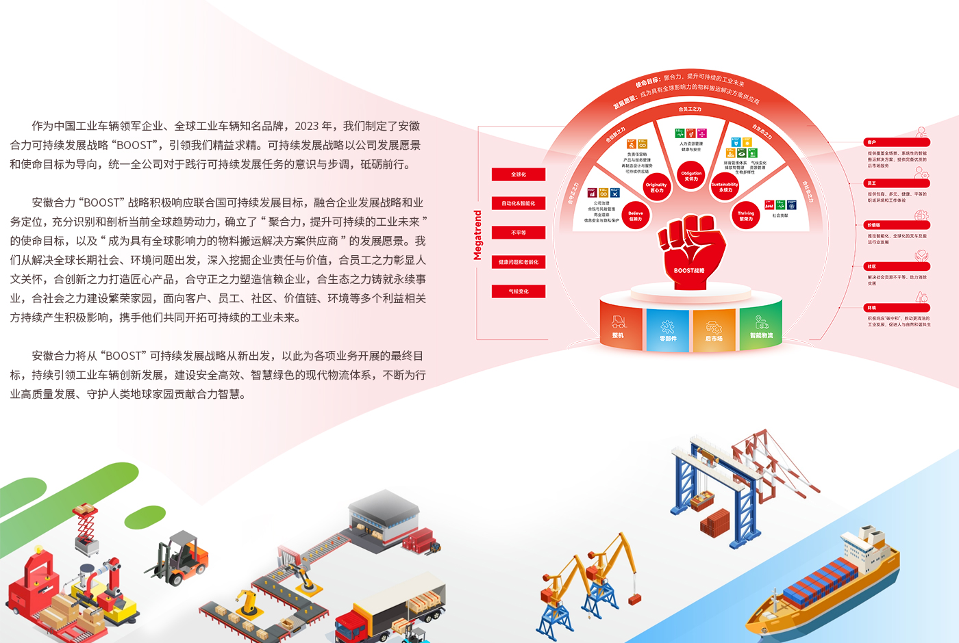 合力叉車将秉持“世界一流 百年合力”的企業願景,以“變革、創新、開放、合作”爲動力,緻力於(yú)成爲全球叉車專家及中國自動化物流設備(bèi)供應商。