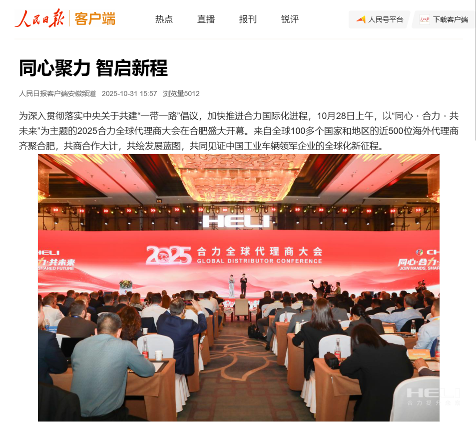 10月28日至31日,“同心・合力・共未來”2025合力全球代理商大會在合肥召開,引發媒體廣泛關注,新華社安徽分社、中央廣播電(diàn)視台安徽總站、經濟日報(bào)、證券日報(bào)、央廣網、中國工業報(bào)、人民網安徽頻道、新華網安徽頻道、安徽日報(bào)、安徽新聞聯播等28家媒體、46名記...